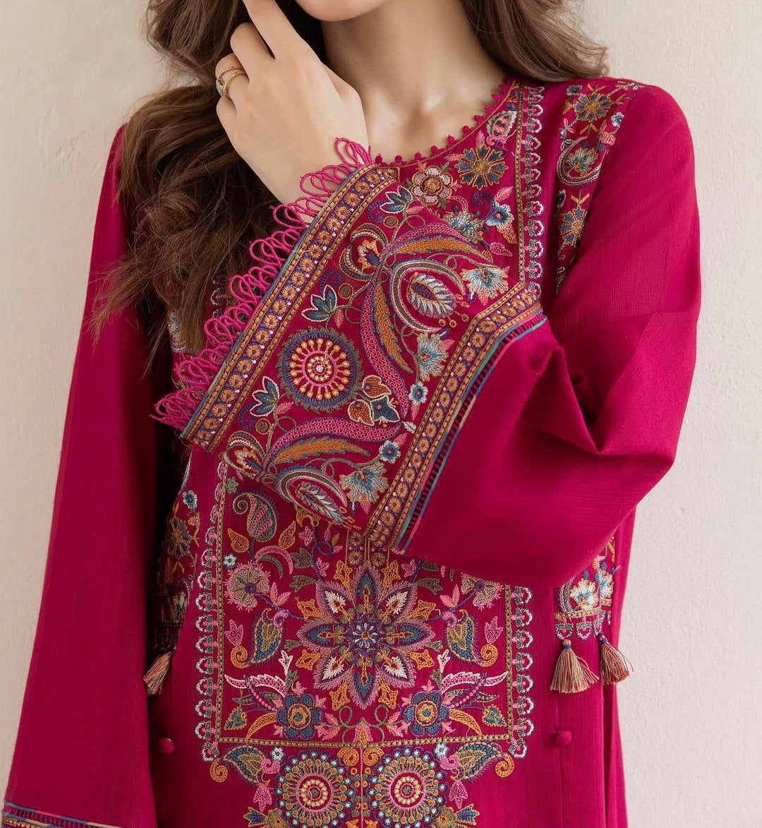 Dhanak fabric with full embroidered front and heavy embroidered sleeves