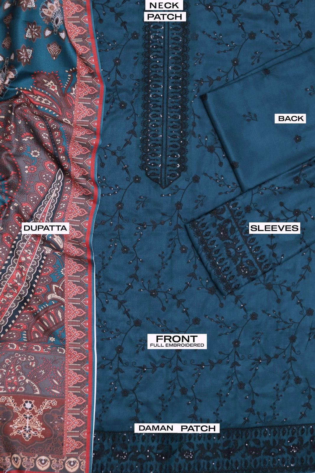 Embroidered neckline and daman patches